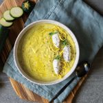 In large saucepan over medium, heat coconut oil. Add onions and salt and cook, stirring often, until softened but not colored, about 8 minutes. Add garlic and cook for 2 minutes, stirring often; stir in zucchini and add vegetable stock. Increase heat to medium-high and bring mixture to boil. Reduce heat and cook until zucchini has softened, about 5 minutes.