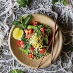 Cut snow peas into bite-sized pieces and add to bowl with noodles along with bean sprouts, cherry tomato halves, watermelon pieces, torn basil leaves, green onion, and remaining 1/3 cup torn mint leaves. Drizzle with remaining dressing before gently tossing all together. Pile onto serving plates and garnish with a sprinkling of chopped peanuts, if using, and lime wedges.