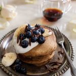 To cook, preheat nonstick griddle or large pan over medium heat. Brush with additional melted coconut oil. Add dollops of pancake batter into pan, nudging corners with your ladle to spread out a bit. Cook for 2 to 3 minutes and flip once bubbles appear all over the surface. Lower heat, as necessary, to avoid burning. Flip and cook on the other side for another 2 minutes, until puffed and cooked through. Transfer to prepared baking sheet and keep warm in oven. Repeat with remaining batter.