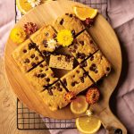 Place mixture into prepared pan and sprinkle on half of chocolate chips. Bake in preheated oven for 15 minutes. Sprinkle on remaining chocolate chips and bake for another 25 minutes, or until a tester inserted into the centre comes out clean.