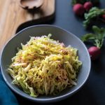 In small bowl, combine lime juice, vinegar, and honey; add radishes. Allow to stand for 30 minutes. Add pinch of salt to cabbage and combine with radish and vinegar mixture.