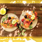 To assemble tacos, place pork on tortillas and top with berry salsa and avocado crema.