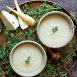 In large saucepan, heat oil over medium heat. Sauté shallots for 2 to 3 minutes. Add stock along with potatoes, parsnips, pear, and thyme. Bring to a boil, then simmer until potatoes and parsnips are fork tender, about 30 minutes. Remove from heat and purée with an immersion blender or in batches in a blender.