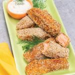 Bake fish for 7 minutes. With tongs, turn fish over and return to oven to bake until fish strips are golden brown and cooked through, about another 7 to 9 minutes. Serve fish sticks warm with yogurt sauce on the side for dipping.