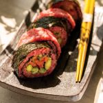 Carefully roll sushi from the bottom upward, making sure to roll tightly and evenly. The inch of nori sheet left at the top will naturally stick to the outside and seal your roll shut. Repeat with remaining nori sheets.