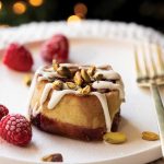 Place an additional piece of parchment paper over top dough before rolling out into 9 x 12-inch rectangle. Taking care to leave 1/2-inch border around edges of dough, dot and spread remaining 2 Tbsp butter over dough and sprinkle with reserved cardamom mixture in even layer. Sprinkle frozen raspberries over cardamom mixture. With the help of the bottom piece of parchment paper, roll up smaller side of dough to create a log. Divide dough into 9 equal pieces and place cut side down in prepared baking pan. Bake in preheated oven until golden brown, about 25 minutes. Let cool in pan for about 10 minutes.