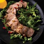 In large bowl, mix olive oil, vinegar, shallot, mustard, salt, and pepper together, and gently toss with arugula. Arrange leaves on large platter. Slice pork and arrange over salad. Garnish with pomegranate seeds.