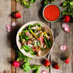 Make ahead: Divide strawberry dressing among 4 large-mouth 24 oz Mason-style jars. Layer in radishes, cucumber, bell pepper, trout, lentils, basil, baby spinach, and goat cheese, in that order. Seal shut with lids and chill for up to three days.