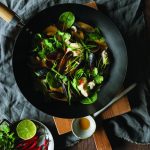 In large saucepan, heat oil and onion and sauté on medium heat for about 3 minutes, until onions have softened but are not brown. With handle of wooden spoon, bruise makrut lime leaves to help release essential oils, and add to saucepan with garlic and ginger. Sauté on low-medium heat for about 2 minutes. Increase heat to medium, add curry paste, and fry for a minute or two. Add rice vinegar and, with wooden spoon, scrape up anything sticking to pan. Add lime juice, coconut milk, fish sauce, and sweet potato and stir to incorporate. Cook on low simmer for about 20 minutes, until sweet potatoes are tender when pierced with fork but still hold their shape. Add rockfish in even layer on top of curry mixture, and top with spinach. Cover with lid and cook for 5 minutes, allowing fish and spinach to steam and release liquid into soup. After 5 minutes, add mussels, cover again, and cook for a further 2 to 3 minutes, until mussels have opened and rockfish is flaky.