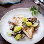 Spoon Grape and Caper Salsa overtop and serve. Delicious served with shaved zucchini laced with chopped nuts, fresh basil, and mint.