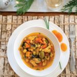 Add spices, salt, olives, chicken, lemon zest (not juice), dried apricots, and stock. Bring to a boil, cover, reduce heat to low, and simmer for 30 minutes, or until carrots and chicken are tender.
