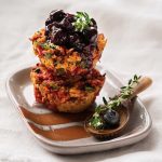 Serve salmon cakes topped with blueberry sauce.