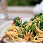 Sautéed Rapini with Spaghetti, Garlic, Toasted Walnuts, and Anchovies
