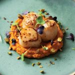 To serve, spoon carrot purée onto serving dish and spread. Place 3 seared scallops on top.