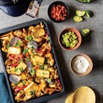 Slice tofu into 1 in strips. In large bowl, place tofu, onion, bell peppers, and cauliflower. Toss with oil and then toss with dried oregano, smoked paprika, cumin, garlic powder, onion powder, and salt.
