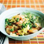 Heat 1 Tbsp camelina or coconut oil over medium heat in cast-iron skillet. Add shrimp and stir-fry for 1 minute. Add peas and green onions and stir-fry for 1 to 2 minutes.