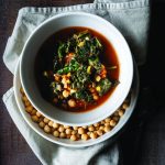 In large saucepan, sauté onion and garlic in olive oil on medium-high heat for about 3 minutes, or until onions appear translucent. Reduce heat to medium, add carrots, and sauté for a further 2 minutes. Add cumin and smoked paprika and cook, stirring frequently, for 1 minute. Add tomato paste and continue to stir, over medium heat, for a further 2 minutes. Pass tomatoes through sieve or food mill; add with chickpeas and vegetable broth. Lay collard greens on top.