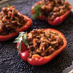 On baking dish, place pepper halves cut sides up, and fill with rice and vegetable mixture. Cover with foil and bake for 30 minutes, then uncover and bake for another 15 to 20 minutes. Garnish with parsley.