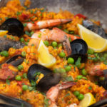 In paella pan or large cast iron pan, heat oil and add sliced sausage. Cook for 5 minutes over medium flame, until golden. Add onion, bell pepper, and garlic and sauté for 5 minutes, until onion is translucent, rotating pan occasionally for even cooking (throughout the recipe). Stir in rice and coat in oil for 1 minute. Add wine and stir for 1 minute, until almost evaporated. Add tomatoes, smoked paprika, dried parsley, and the 6 cups saffron-infused broth and simmer, uncovered, for 12 minutes over a medium flame. If paella looks dry, move pan away from the heat a little and add 1 cup water. You want a crust to form on the bottom, but you don’t want it to burn.