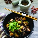 In small skillet, heat 1/4 cup vegetable oil over low heat. Add Sichuan peppercorns and cook for 1 minute. Remove peppercorns and discard, reserving oil. Heat oil until shimmering, but not smoking. Pour over spices in jar. Stir and infuse for 1 minute before adding vinegar, soy sauce, salt, and 1 Tbsp water. Stir to combine.