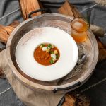 When oven-roasted vegetables are done as you like, transfer along with any of their precious juices to saucepan with vegetable stock mixture. Stir in, return to heat, and bring to a gentle boil to fully amalgamate flavors. Stir in vinegar and maple syrup. Using handheld stick blender or high-speed blender, purée mixture until smooth and creamy. Add a splash more vinegar coupled with salt and pepper, to taste, if you wish.
