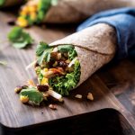 Slightly warm soft tortillas so they’re easier to handle and are less likely to split as you roll them. Place tortilla on work surface and set lettuce leaf off-center on tortilla. Place 1/4 of the cooked rice just below center of tortilla. Top with 1/4 of each of the following: black beans, corn, kimchi, cheese, and cilantro. Be sure ingredients are slightly off-center, with at least a 1 inch border.