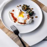 To poach eggs, in large saucepan, bring water to a simmer over medium-high heat. Add vinegar and pinch of salt. Stir gently and add eggs, one by one, to water. Poach for 2 to 3 minutes, or until eggs float to surface. Using a slotted spoon, gently remove eggs, pat dry with clean kitchen towel, and place on center of each plate. Drizzle 1 tsp red pepper flake-paprika oil over surface of yogurt on each plate and serve.