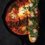 Crack eggs into individual pinch bowls or glasses and set aside. Press the bowl of a soup ladle into sauce and pour in an egg. Then tip contents slowly into tomato mixture. Repeat with remaining eggs, arranging them evenly over surface of skillet. For soft eggs, simmer for approximately 10 minutes, covering halfway through. Sprinkle with parsley and serve with a warm tortilla or a piece of crusty bread.