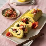 On side nearest you, carefully separate edge of parchment from long side of egg roulade and roll up roulade tightly. Place, seam side down, on serving platter. Cut into 10 slices and ladle pico de gallo along edges with a bit overtop. Roulade can be served warm, at room temperature, or chilled
