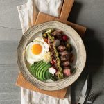 Dice or thinly slice steak into strips. Assemble bowls by placing cooked vegetables on bottom, layered with steak slices then cooked eggs, and top with the chive gremolata. Add optional toppings, if desired. Serve warm.