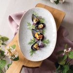 Remove one side of shell of each mussel and top the shell containing the meat with tomato fennel relish. Place on large serving platter and garnish each mussel with a sprig of alyssum.