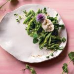 In bowl or on serving platter, place snow peas, snap peas, and pea shoots. Sprinkle finely chopped mint and chives overtop.