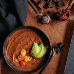 In stockpot over medium-high, heat oil. Add onion and sauté until translucent, about 4 minutes. Add garlic, carrot, celery, and sun-dried tomatoes. Continue to cook, stirring often, until carrots have softened, about 5 minutes. Season with salt, coriander, smoked paprika, and cocoa powder. Cook for 1 minute to toast spices before adding white wine. Cook, stirring constantly, until white wine has evaporated, about 2 minutes. Stir in diced tomatoes, water, and pear. Bring soup to a simmer, reduce heat to medium-low, cover, and let soup simmer, stirring occasionally, for 30 minutes. Remove stockpot from heat and stir in unsweetened chocolate until chocolate is fully melted and well incorporated into the soup.