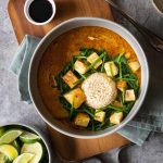 To serve, in deep bowls, add a scoop of rice followed by ladles of coconut soup (be sure to get all of the chicken or chickpeas or tofu in there, too!). Top with sweet potatoes, greens, green onions, and cilantro. Serve with lime wedges and tamari for seasoning.