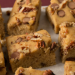 Pour batter into prepared baking dish, and spread evenly. Sprinkle with remaining ¼ cup chocolate chips and pecans.
