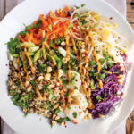 In medium bowl, whisk peanut butter and tamari or soy sauce together until smooth. Whisk in 1 Tbsp lime juice, maple syrup, sesame oil, ginger, and red pepper flakes. Add more lime or tamari/soy sauce to taste, if you wish. Drizzle over salad.