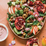 For salad, place arugula on large platter. In medium bowl, gently toss together apple, avocado, and grapefruit. Arrange atop arugula. Sprinkle with arils, walnuts, and hempseeds. Garnish with flowers and mint, if desired.