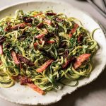 Use spiralizer to cut zucchini into noodlelike strands. Alternatively, use serrated vegetable peeler to shave zucchini into ribbonlike noodles. In large bowl, toss together zucchini noodles, bell pepper, and spinach.