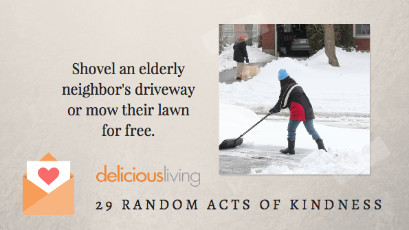 29 random acts of kindness By Jessie Shafer | February 1, 2017 22/31 February 21 Shovel an elderly neighbor's driveway or mow their lawn for free. 0 comment 42 Facebook LinkedIn Twitter Google + Pinterest Print