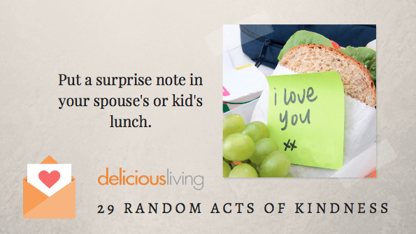 29 random acts of kindness By Jessie Shafer | February 1, 2017 23/31 February 22 Put a surprise note in your spouse's or kid's lunch. 0 comment 42 Facebook LinkedIn Twitter Google + Pinterest Print