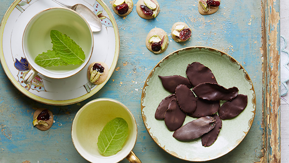 Craving chocolate-mint goodness? Gather a large bunch of fresh mint leaves from your herb garden to dip in chopped bittersweet dark chocolate.