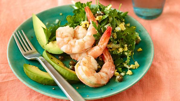 In this beautiful and balanced salad, lemon-marinated parsley replaces lettuce and nicely complements sweet, ripe avocado and chilled shrimp.