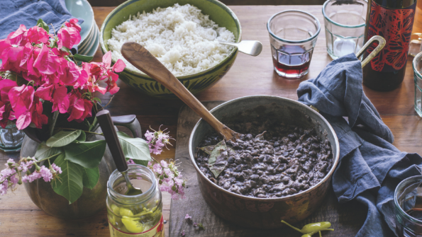 In their new cookbook, The Family Table: Recipes & Moments from a Nomadic Life (William Morrow, 2018), the Smolletts share the good food that has shaped their lives. The book includes 125 recipes that pay tribute to their past and present, to food traditions across the country and to the global cuisine they’ve encountered in their travels, such as this long-simmered black beans and coconut-rice side dish.